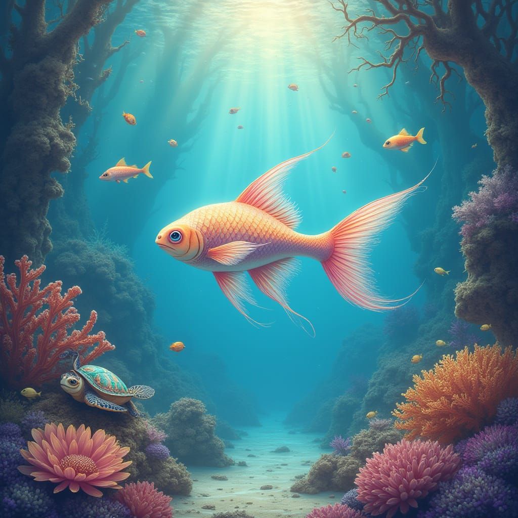 This enchanting image depicts a majestic fish swimming through a vibrant coral reef, surrounded by a school of smaller fish, a sea turtle, and other marine creatures, all blending into the intricate landscape of the reef. Rendered in a dreamy, fantastical style with soft brushstrokes and delicate pattern...