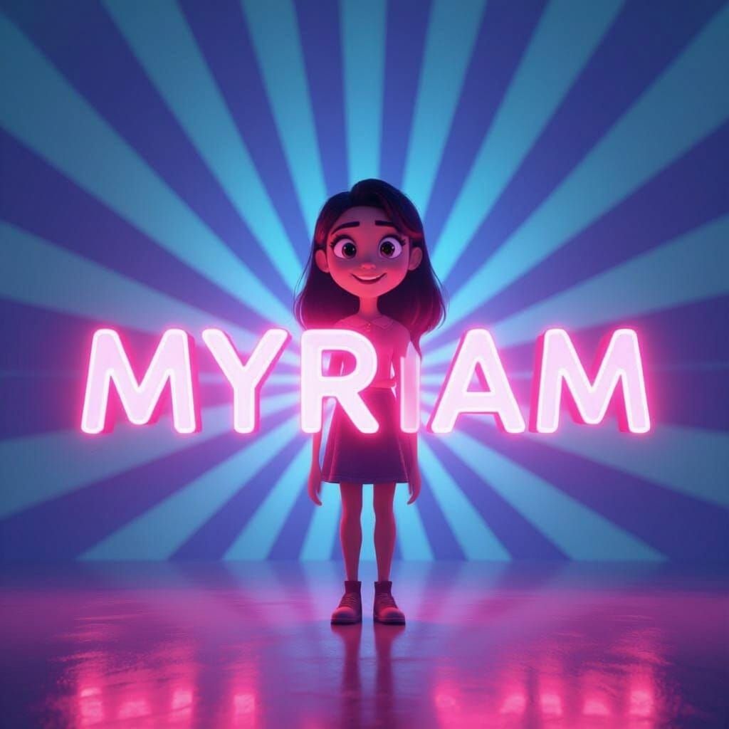 This image features the name "Myriam" rendered in large, bright neon letters. It's presented in a lively 3D digital art style with a colorful radial gradient background.