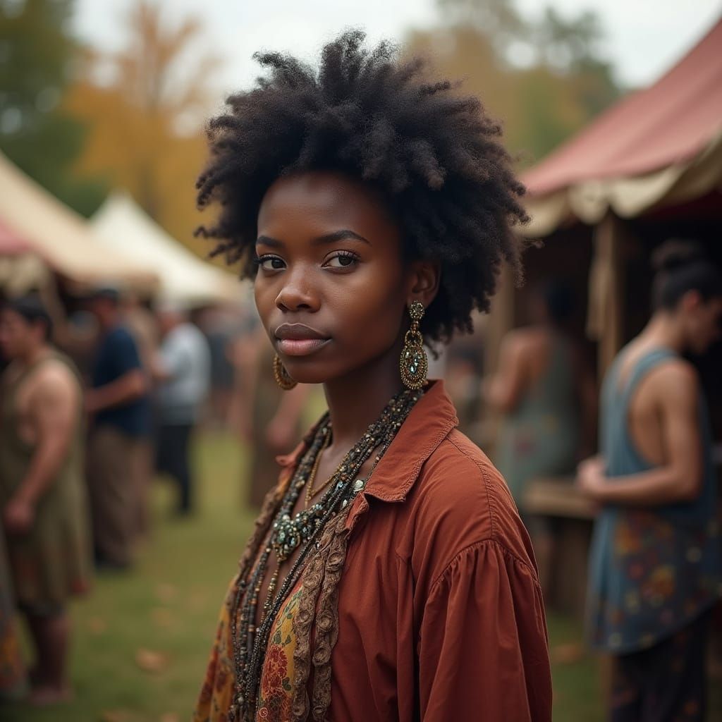 This hyper realistic image captures a young African American woman with black hair, adorned in pagan attire and hippie jewelry, amidst a bustling autumn marketplace during a festival.