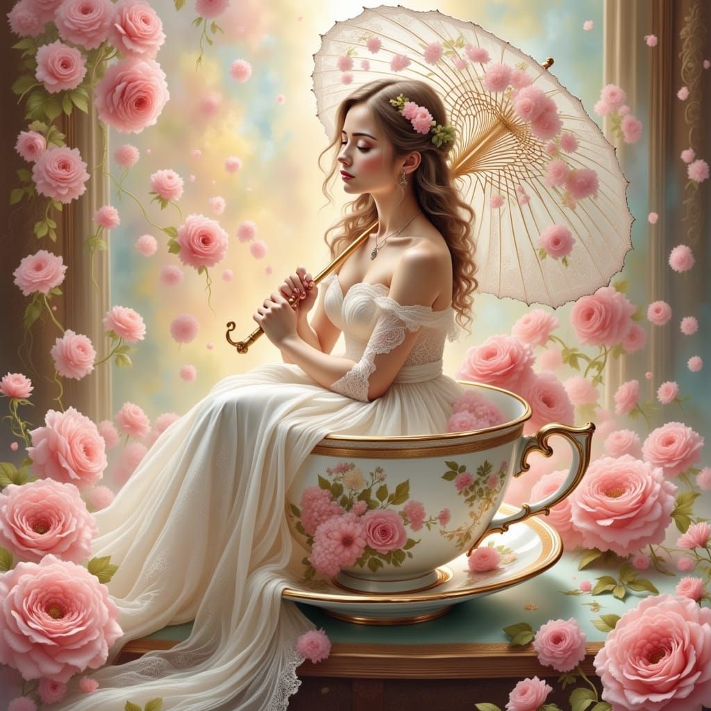 This image shows a woman in lace sitting inside a giant coffee cup with a parasol. Rose petals, golden light, and rain surround her in this hazy, pastel-colored watercolor.