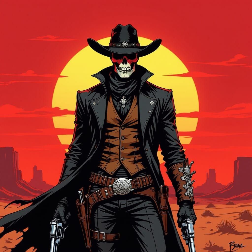 A haunting image of a gunslinger in a tattered duster and ornate vest, standing against a crimson desert sunset, with a skull gleaming beneath his cowboy hat. Inspired by surreal spaghetti western aesthetics.