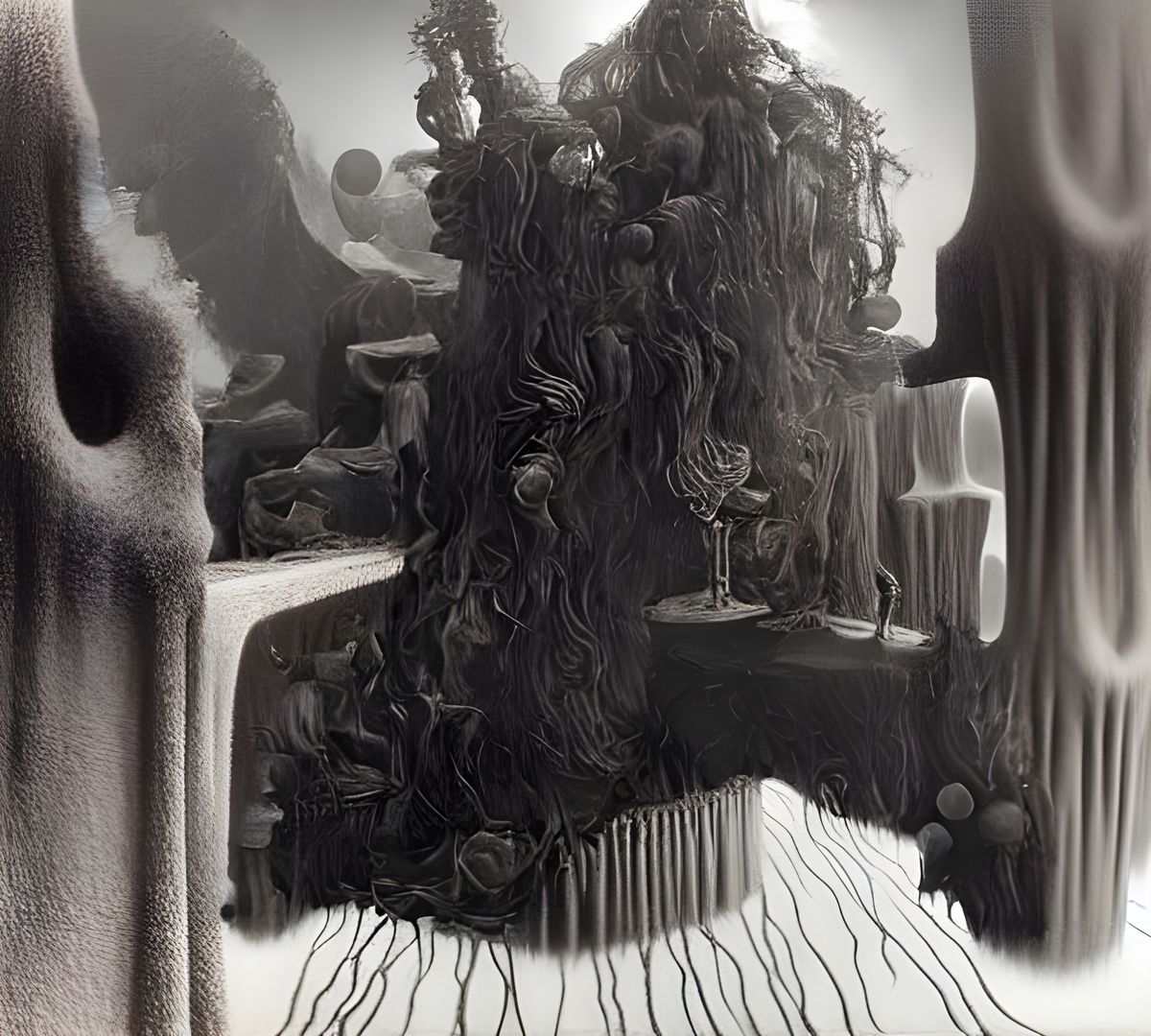 This image depicts a macabre, Lovecraftian scene of fallen angels and a spool of human hair, reminiscent of Zdzisław Beksiński's style. The dreary photograph has been upscaled to reveal exquisite detail.