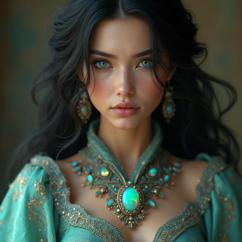 A stunningly beautiful woman in a vibrant, hand-beaded gown with intricate patterns and shimmering threads, complemented by a futuristic piece of jewellery featuring a glowing opal and delicate silver filigree, rendered in hyperrealistic detail with soft lighting and subtle shadows, showcasing a deep, ri...
