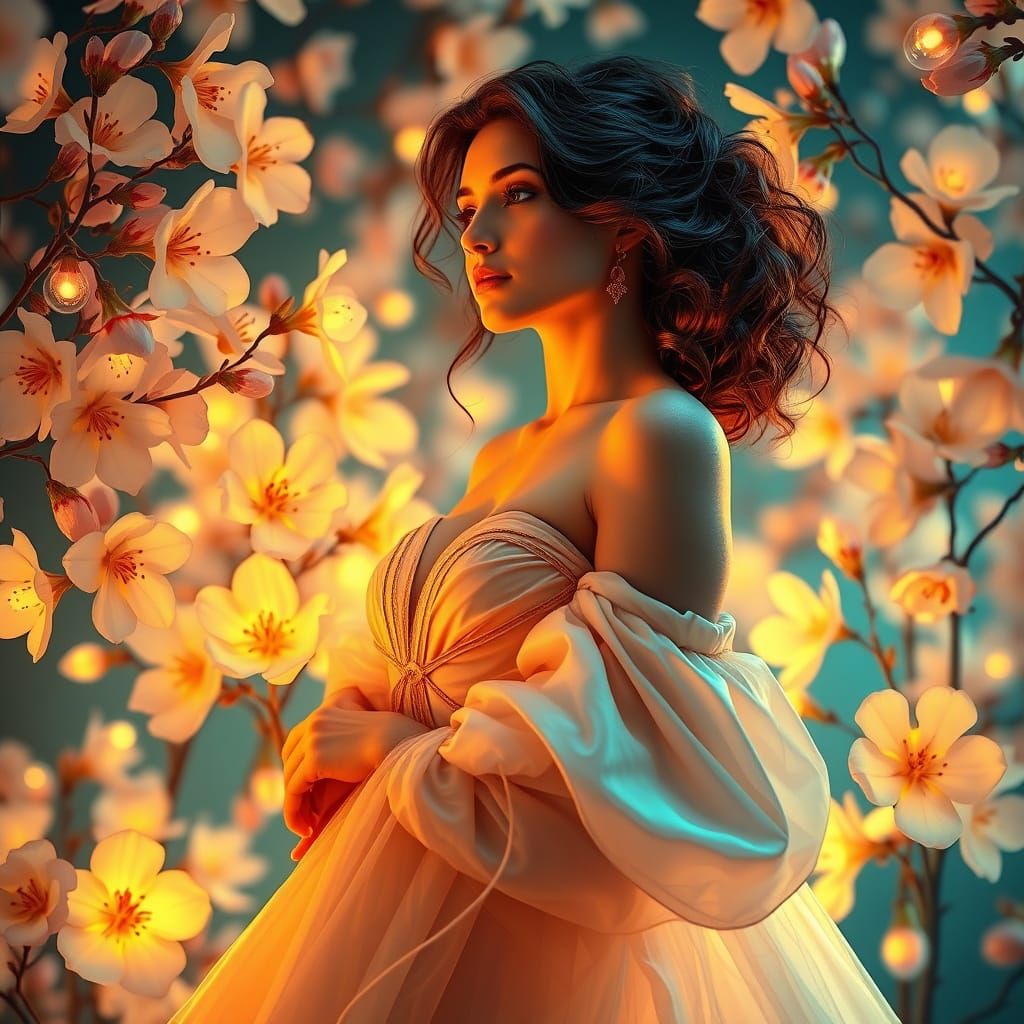 A radiant woman in a flowing gown is surrounded by glowing blossoms in this image. It evokes art nouveau, neon futurism, and vibrant digital painting styles.