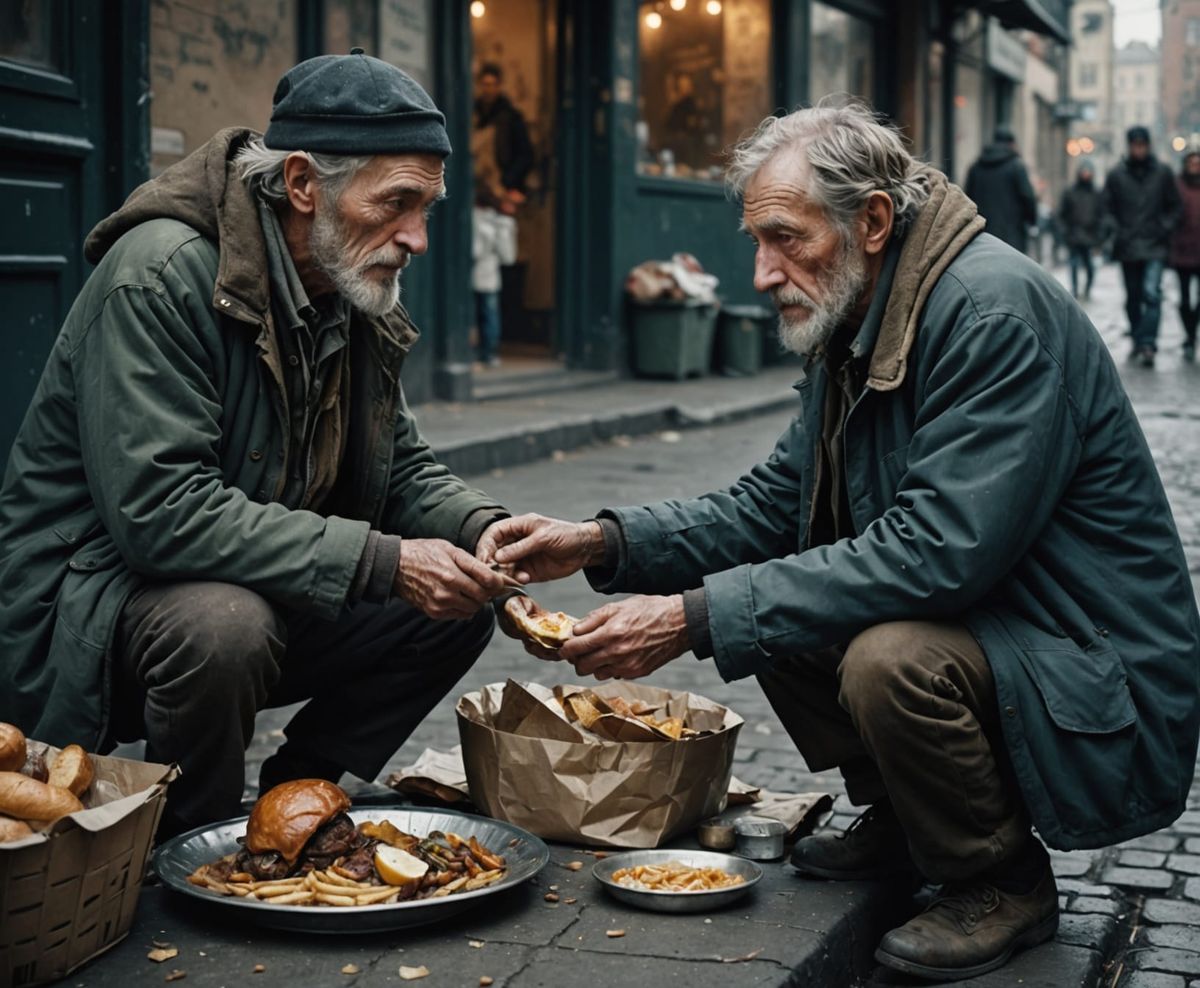 This image depicts an old homeless man being given food, rendered in an epic, cinematic, and highly detailed digital matte painting style with dramatic atmospheric lighting.