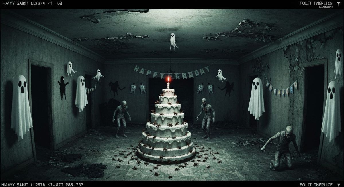 This image shows grainy CCTV footage of a disturbing birthday party in an abandoned hotel, featuring ghosts, zombies, and insect-covered cakes in a gritty, low-light style.
