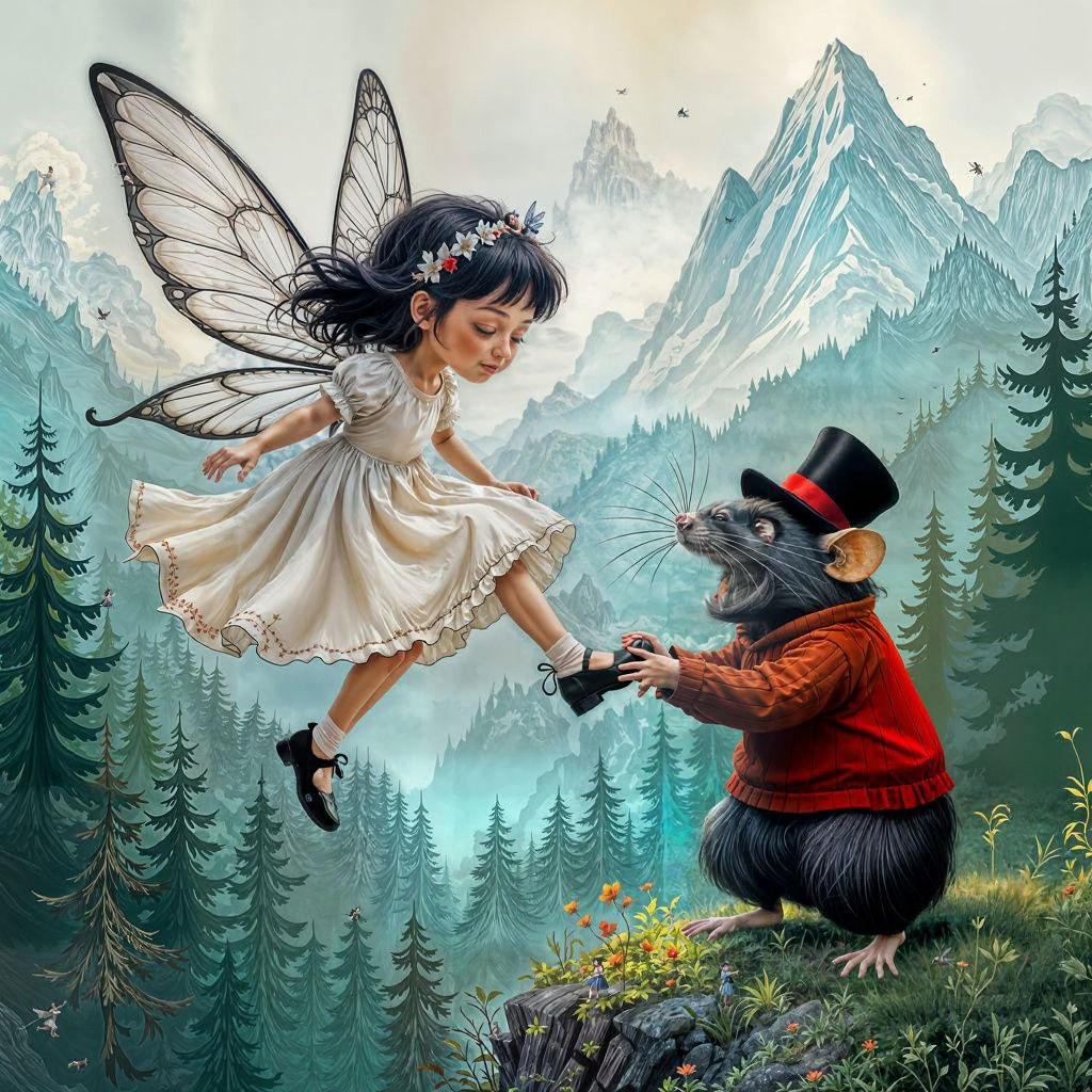 This image shows a young fairy escaping a rat in a top hat by flying above an enchanted forest. The rat is holding onto her shoe, being pulled into the air.