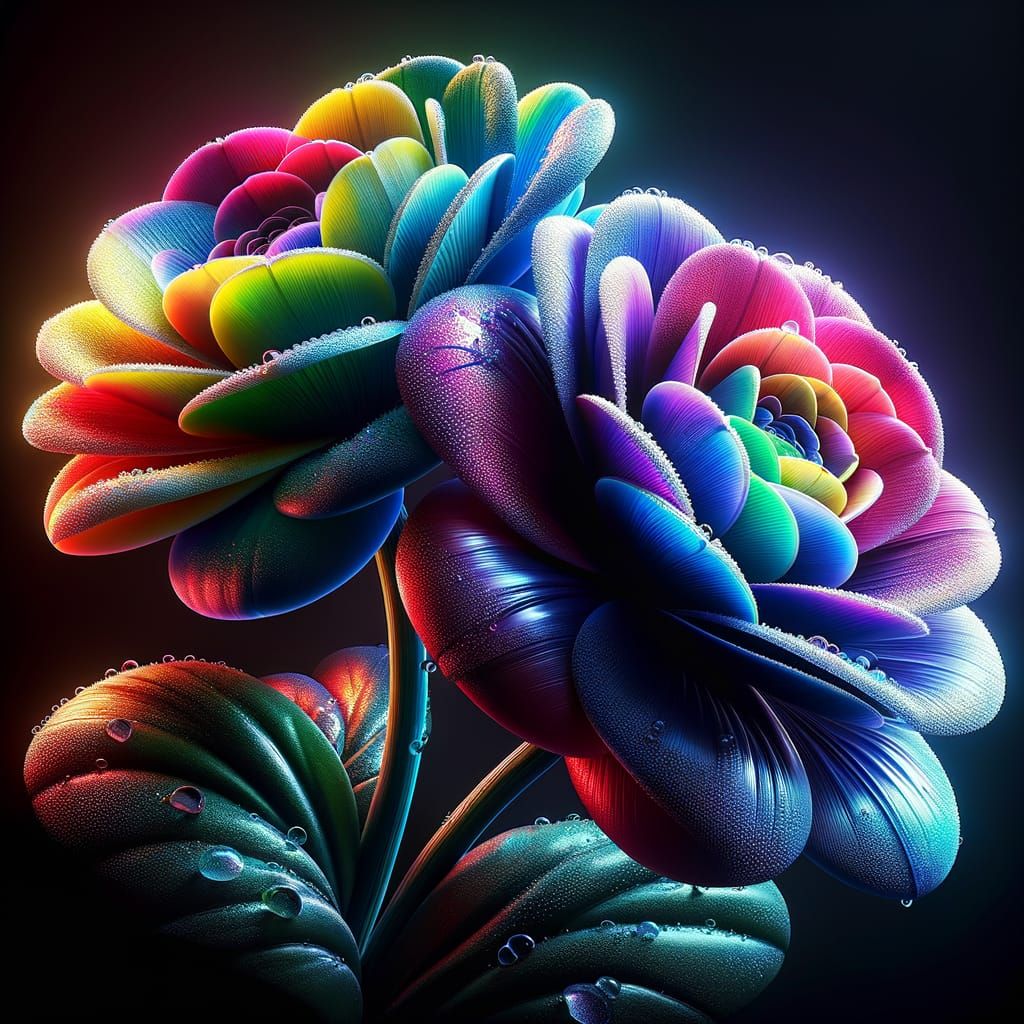 This image shows two surreal flowers displaying vibrant, rainbow-colored petals. The macro photography style captures the gradient hues and dew-covered leaves in ultra high definition, illuminated against a dark backdrop. The flowers have an inner glow.