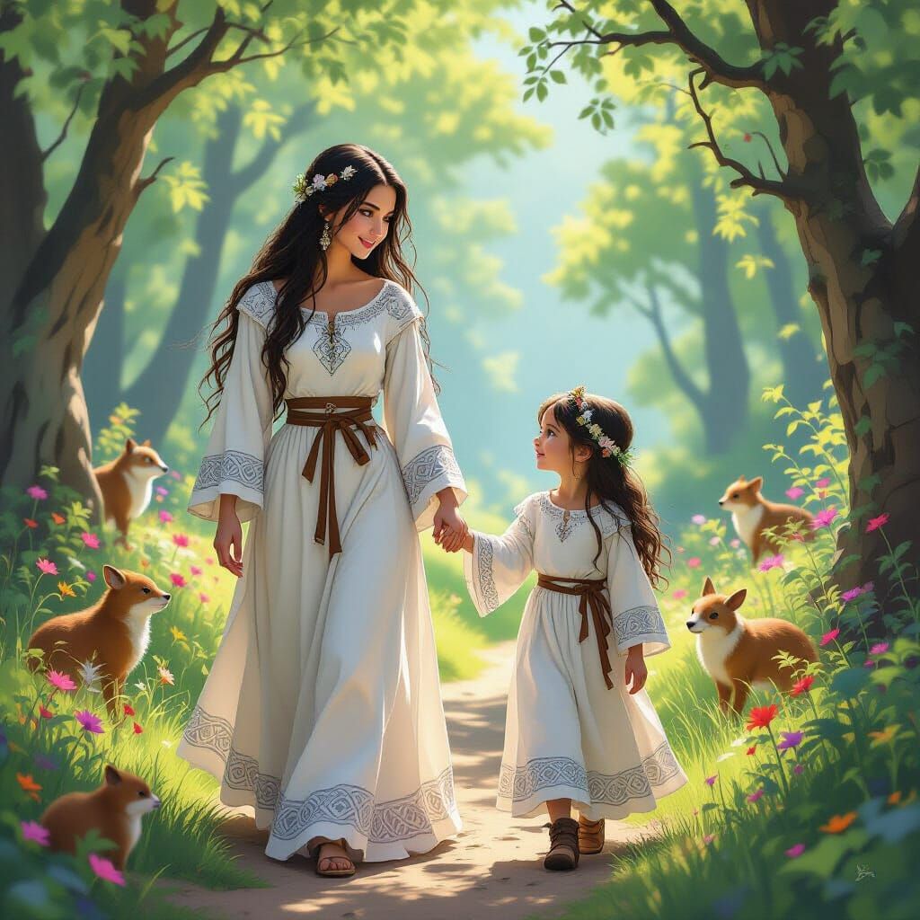 A vivid image portrays a medieval woman and young girl with matching black hair and blue eyes strolling through a lush forest. They are wearing white dresses featuring Celtic designs and the artwork is rendered with soft, warm lighting.