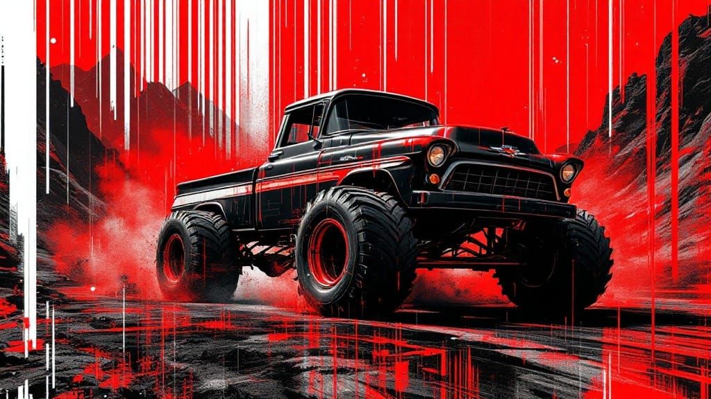 This image shows a digital artwork featuring a 1957 Bel Air monster truck amidst a severe glitch effect with vibrant red, white, and black streaks, set against a smoky red background.