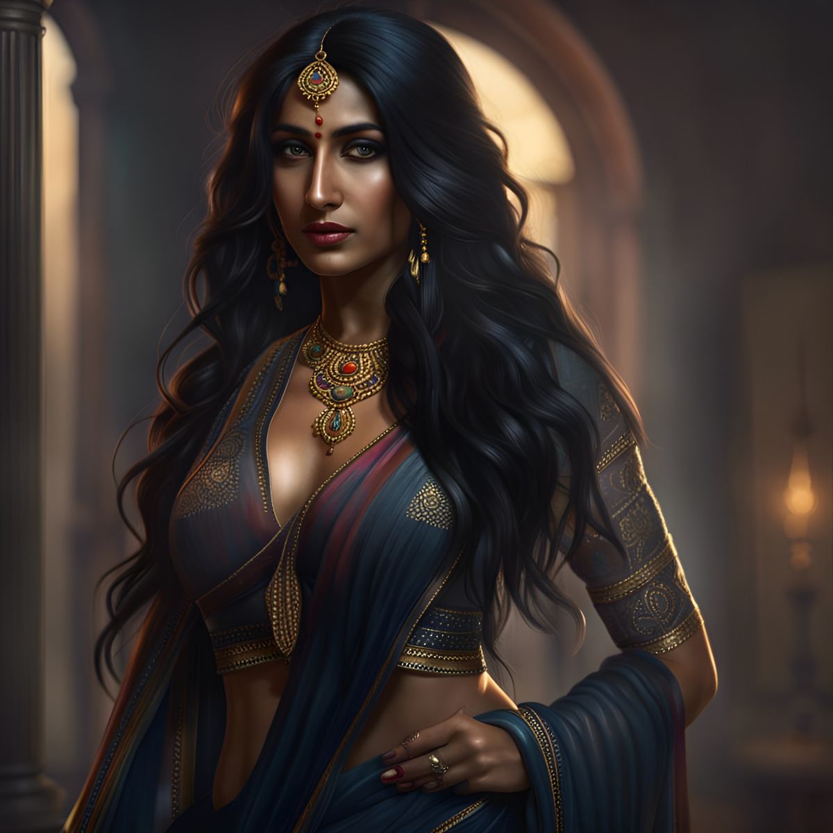 This image shows a stunning Indian woman with long black hair, adorned with jewelry and a saree, standing on gala steps and smiling. The image is rendered with professional photography techniques.