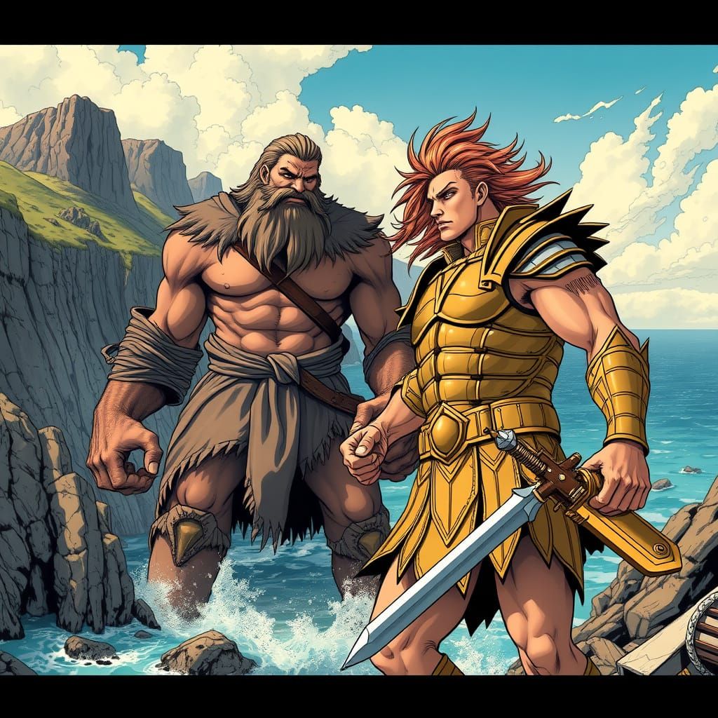 A dramatic landscape of the Cornish Coast serves as the backdrop for an epic battle between a towering giant and a chiseled warrior, both clad in striking attire, in a vibrant and dynamic Manga-inspired artwork.