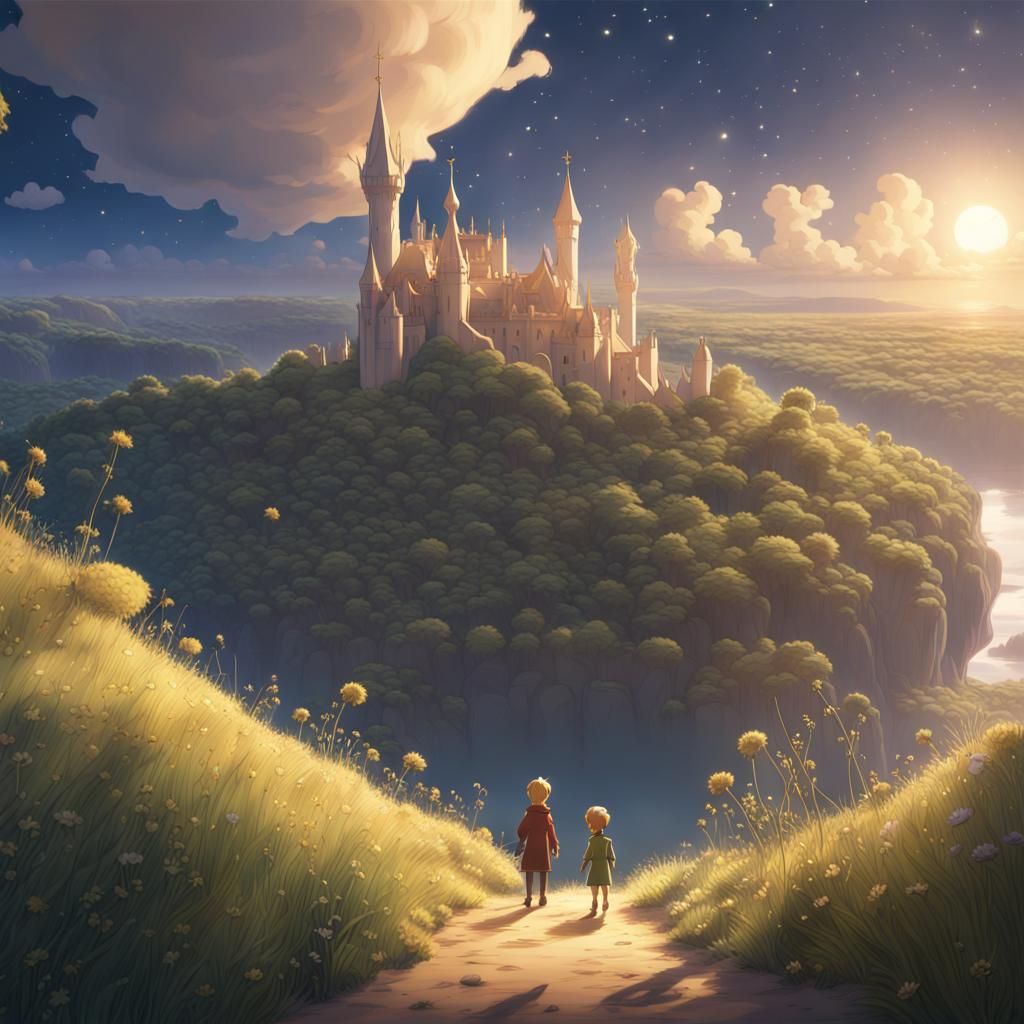 This image shows the Little Prince gazing at a star. The artwork features deep colors and intricate details, rendered as fantasy concept art in a Studio Ghibli anime style.