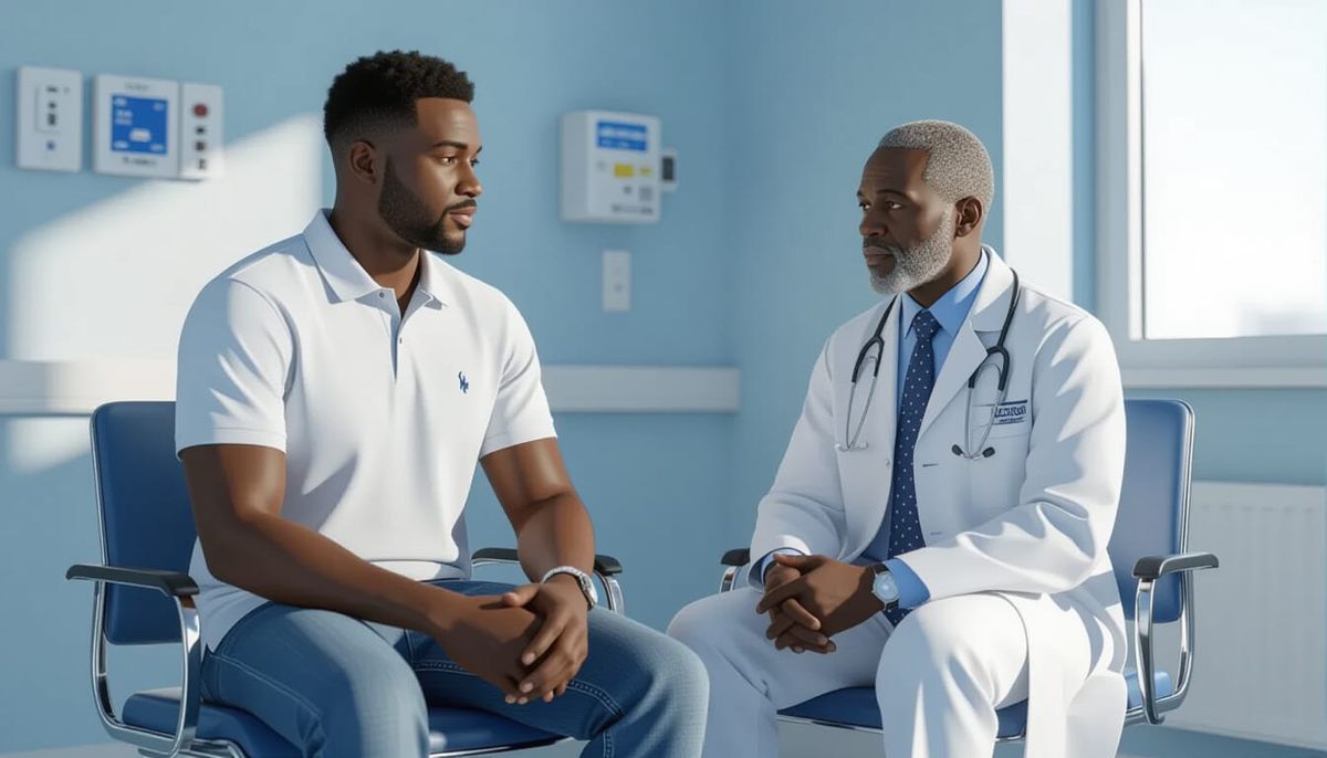 This image shows a younger African man in casual wear with an older African man in doctor's clothes, seated in a hospital office. Rendered with dramatic 3D shading and cinematic lighting.
