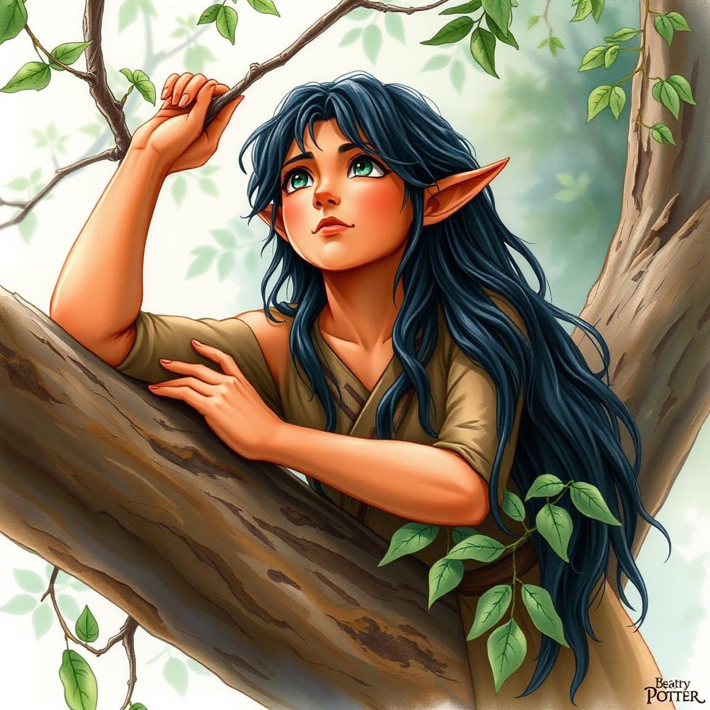 This serene watercolor painting depicts a handsome forest elf reclining on a tree branch, surrounded by leaves and vines. With radiant copper skin, dark hair, and piercing green eyes, he embodies harmony with nature, his simple attire blending seamlessly into the foliage.
