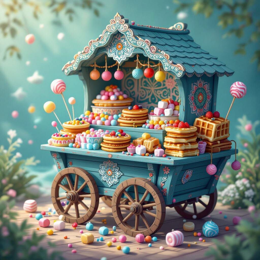 This image features a charming wooden cart filled with colorful sweets like candies, pancakes, and waffles. It showcases intricate mandala patterns and a vibrant blue and turquoise color scheme, evoking a magical, dreamlike pop surrealism aesthetic.