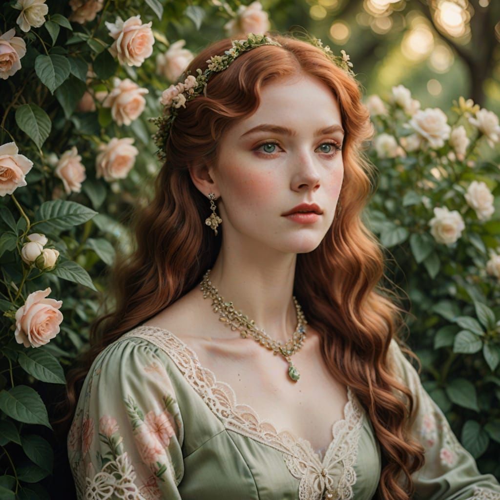 This image is a romantic portrait of a beautiful redheaded woman in a vintage floral dress, surrounded by lush greenery and soft, warm lighting, evoking a classic, timeless beauty with a delicate, elegant aesthetic.