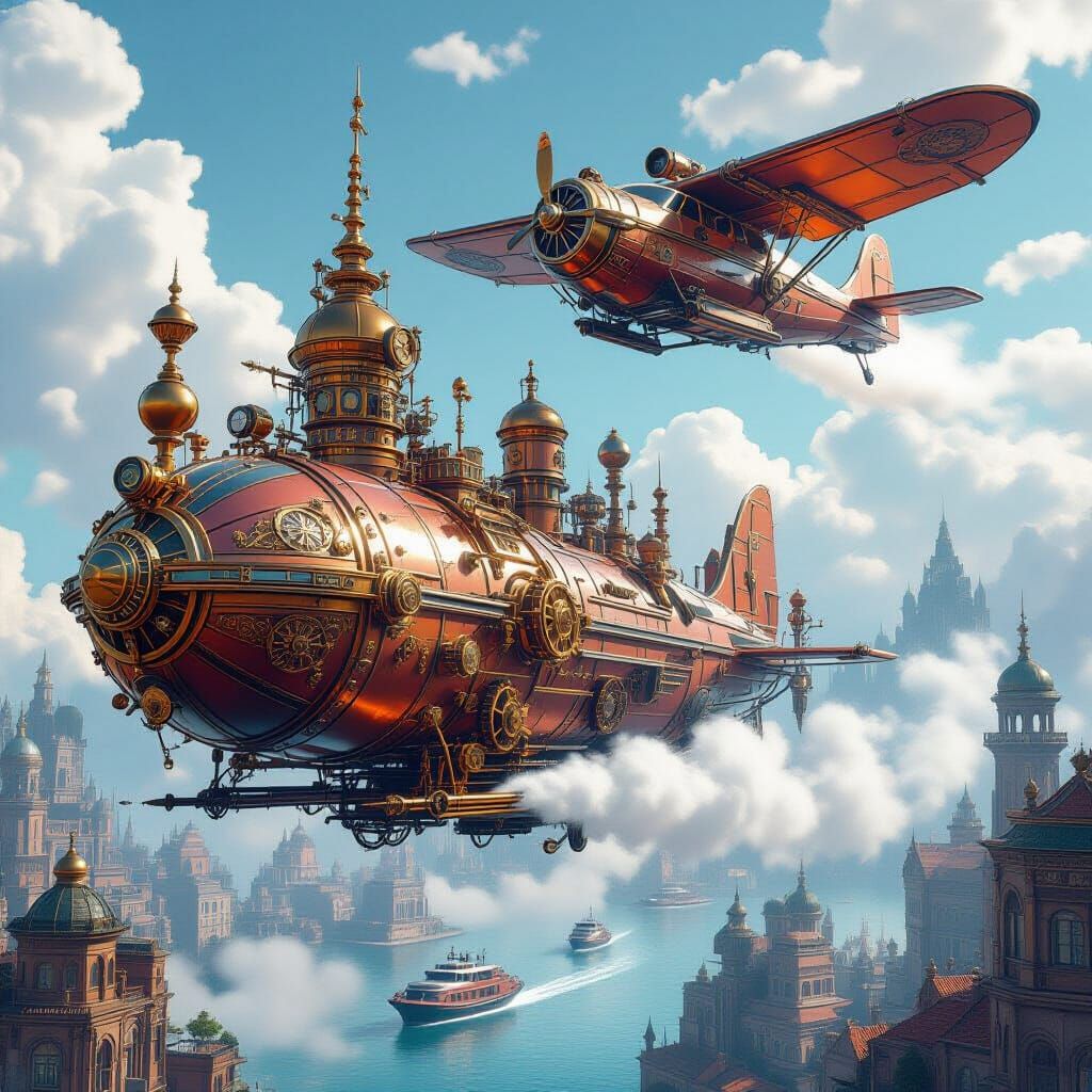 A steampunk citadel adorned with copper filigree and steam pipes. A flying airboat soars above, propelled by a steam waterjet, rendered in a vibrant 3D anime style with ultrafine textures and breathtaking lighting.