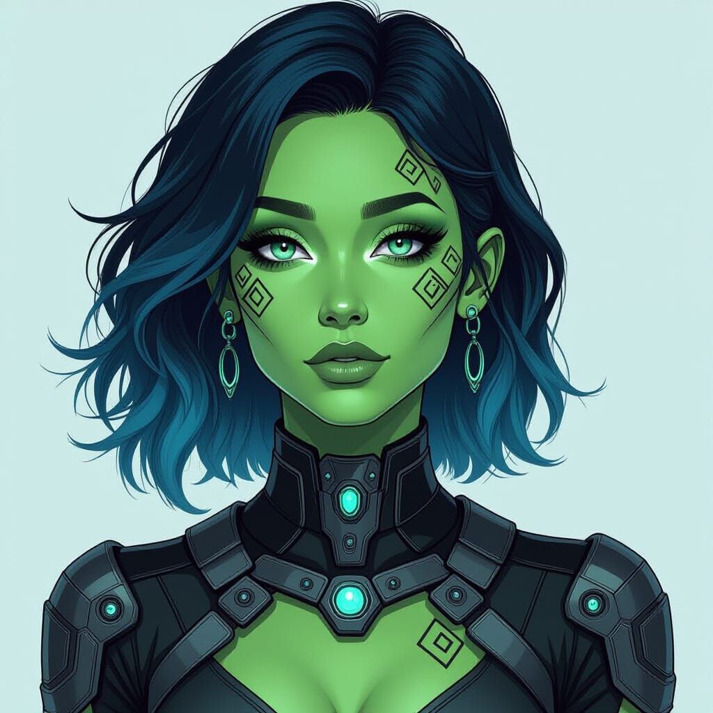 This image shows a green-skinned woman with blue-black hair and diamond-patterned tattoos on her cheekbones. She has bright blue eyes and wears futuristic, mechanical-style clothing in a drawn aesthetic.