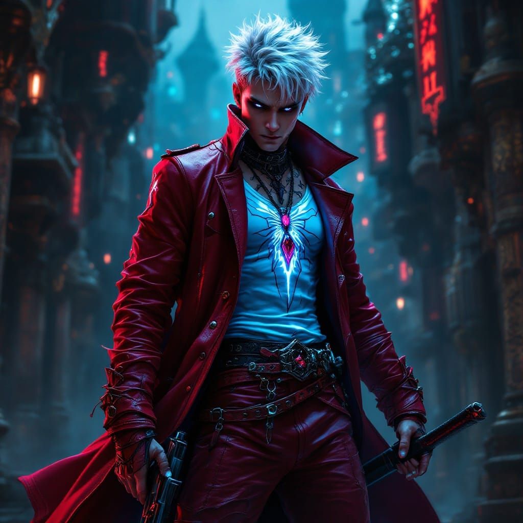 This image depicts a powerful demon hunter, clad in intricate red leather armor, standing in a commanding pose, surrounded by a dark, immersive cityscape with bioluminescent tattoos glowing in neon hues.