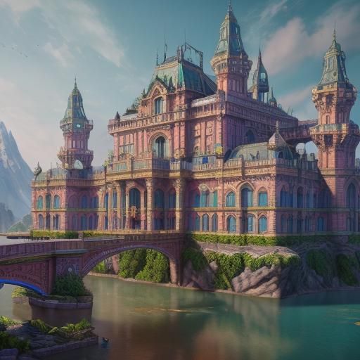 This image shows many famous historical landmarks set within a vibrant natural landscape. The detailed matte painting features deep colors and intricate details, reminiscent of fantasy concept art.