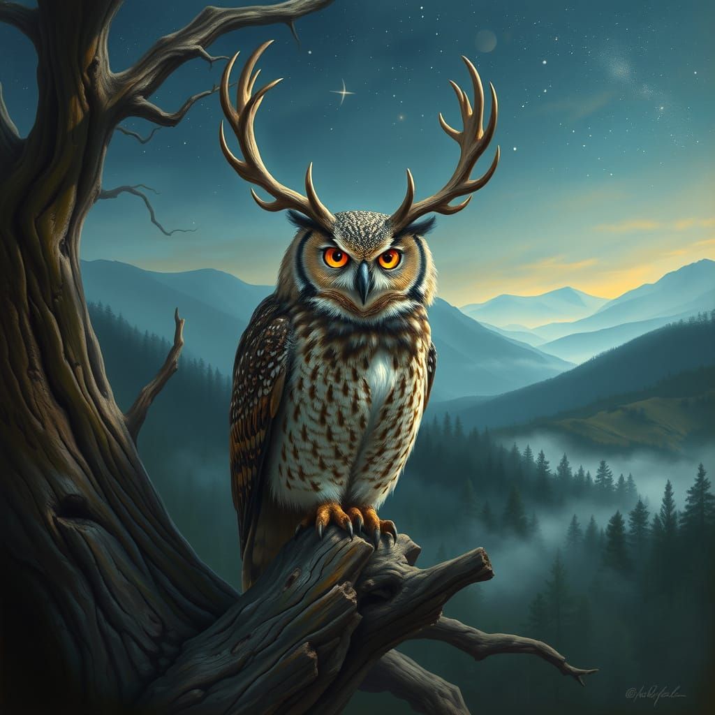 A hyperrealistic image of an owl with stag antlers sitting on an old oak in a misty forest. The owl has glowing eyes and intricately patterned feathers, in a painterly style.