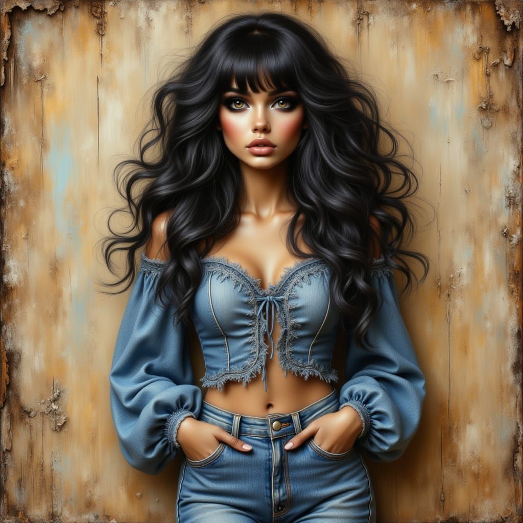 a beautiful and curvy black vintage hair style with bangs, wearing 70's denim bell bottom blue jeans and blue crop top tied at the waist, a textured background <lora:Boho Ladies:0.45> <lora:Just Another Lora:0.55> <lora:Animals:0.45> <lora:I Seen A Ghost:0.35>