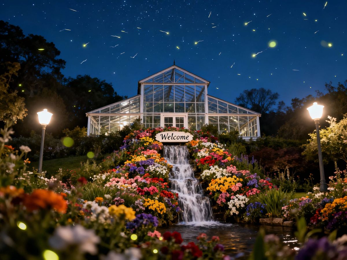 A stunning realistic photo of an elegant glass house by a flower-filled waterfall under a starry night sky. Illuminated by warm lights, with soft lighting and shallow bokeh.