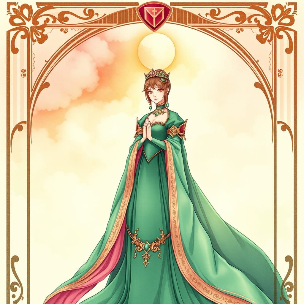 This image shows a tarot card depicting an empress in a medieval-style emerald dress. The artwork has a pastel monochromatic watercolor aesthetic, reminiscent of anime key visuals.