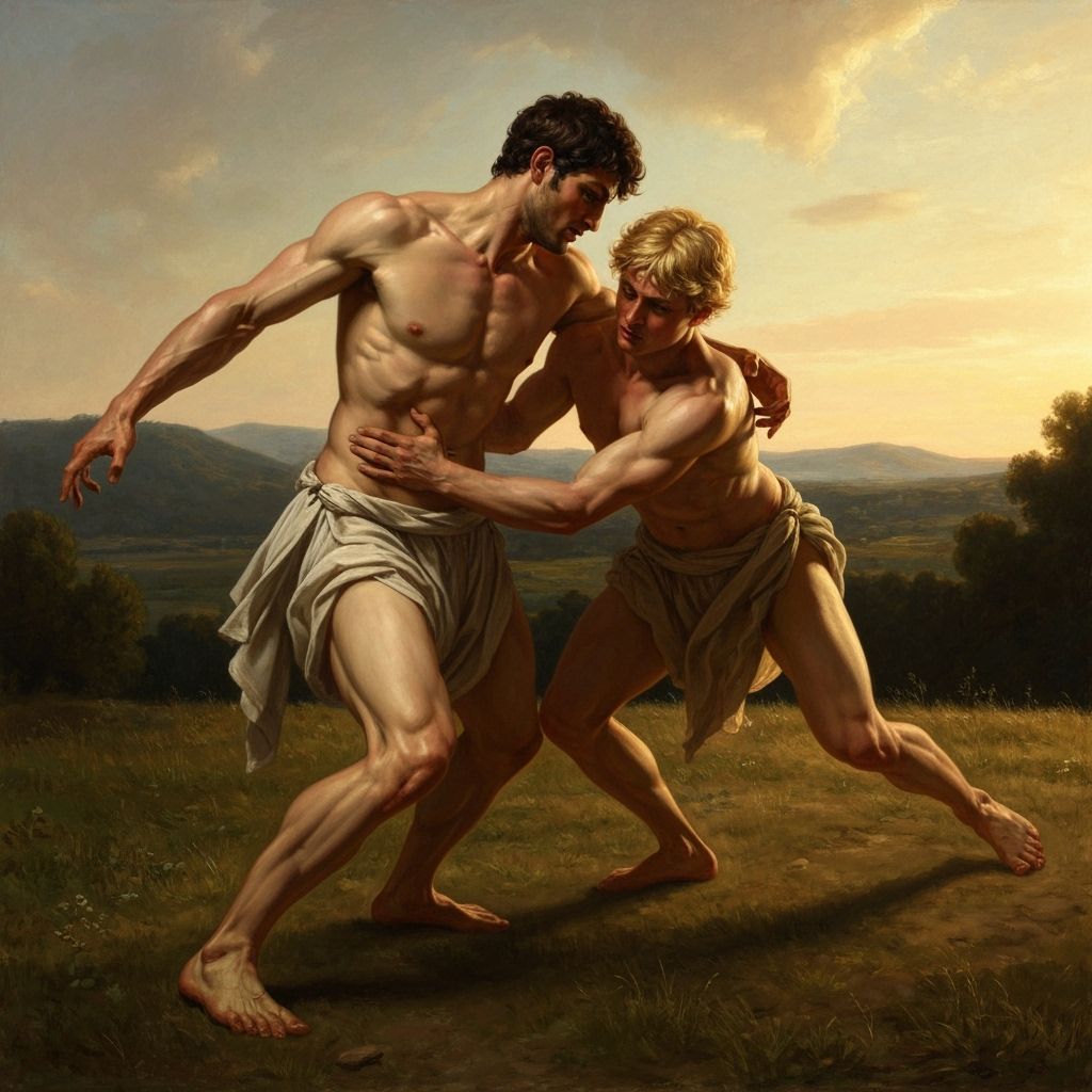 This image shows Greek hero Theseus and his friend Pirithous wrestling in a sunlit field. Rendered in a dramatic classical oil painting style with strong light and shadow.