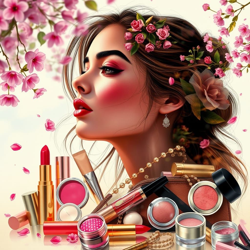 This image is a hyper-realistic double exposure portrait of a woman surrounded by intricately detailed cosmetics and accessories, rendered in vivid, candy-inspired colors and blending surreal and digital art styles.