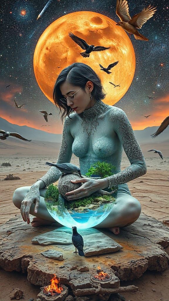 This surreal image depicts a woman with a body like parched earth, showcasing a glowing inner oasis with lush greenery. Inspired by surrealist collage and bioart.