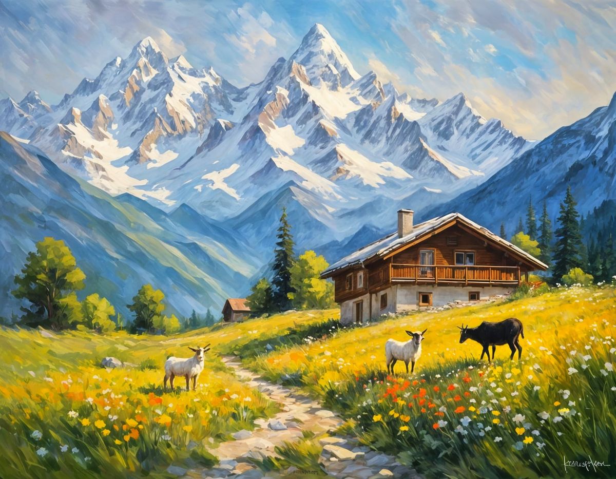 This image captures a breathtaking Swiss Alps landscape in an Impressionist style. Majestic peaks, a cozy chalet, and wildflowers are rendered with bold, creamy brushstrokes and luminous light, evoking a pastoral masterpiece.