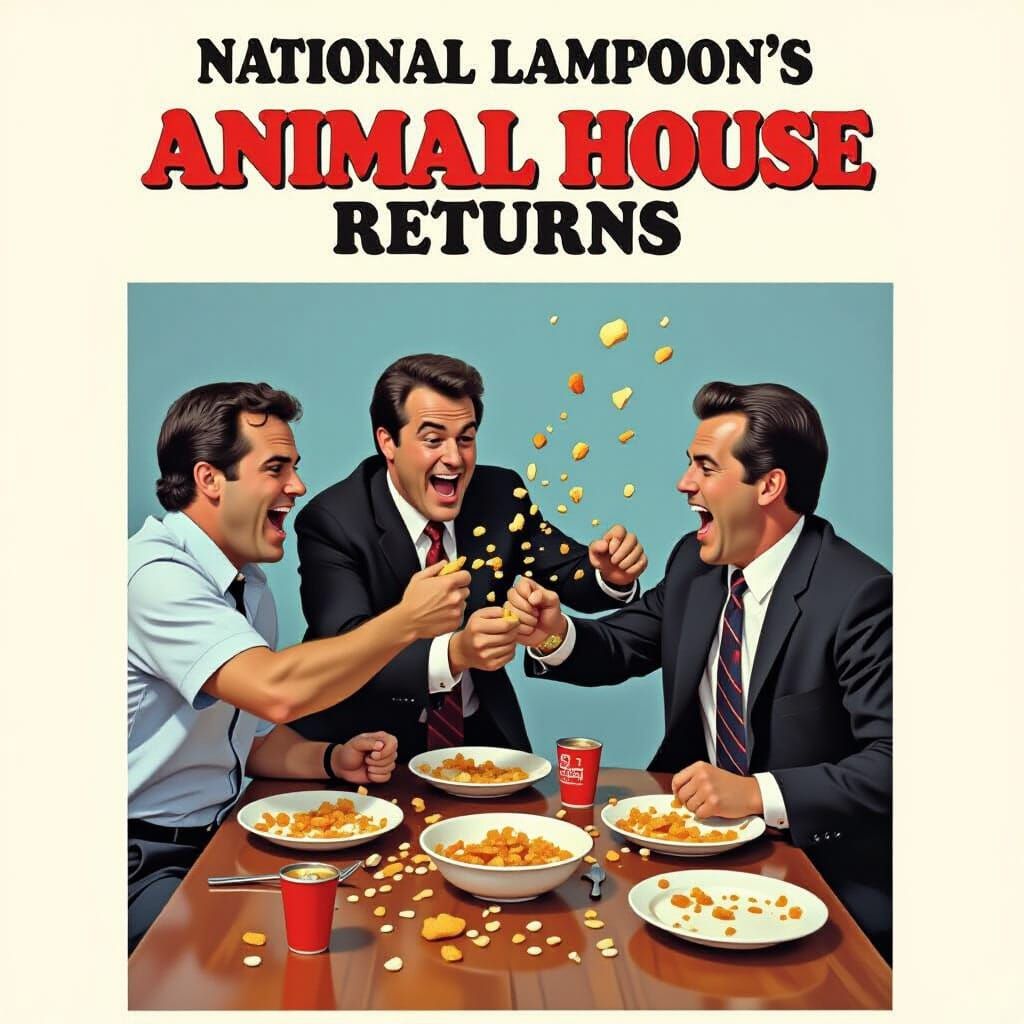 This image shows a movie poster for 'National Lampoon's Animal House Returns,' featuring stars in a chaotic food fight scene.