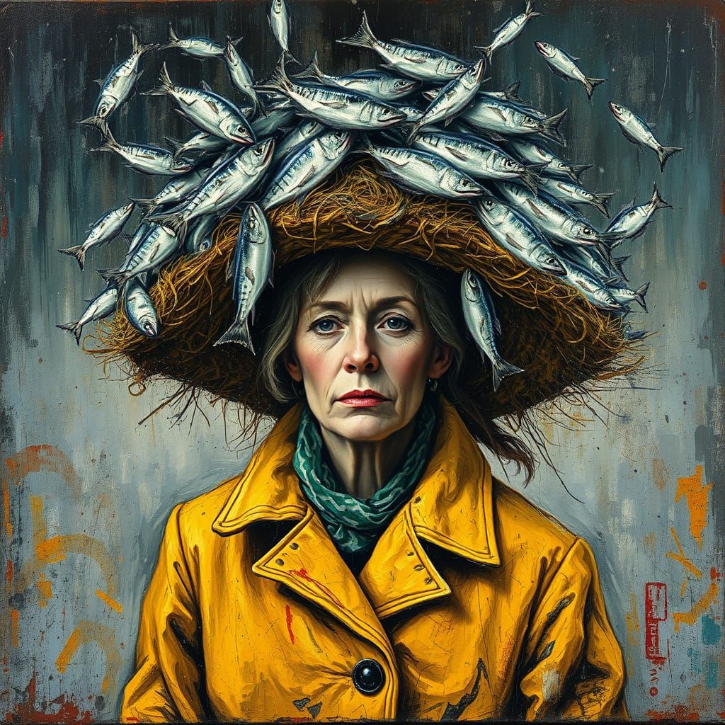 This impasto painting depicts a woman in a worn yellow coat and straw hat, with a giant swarm of silver herrings flying above. Rendered with thick, textured brushstrokes and dramatic lighting.