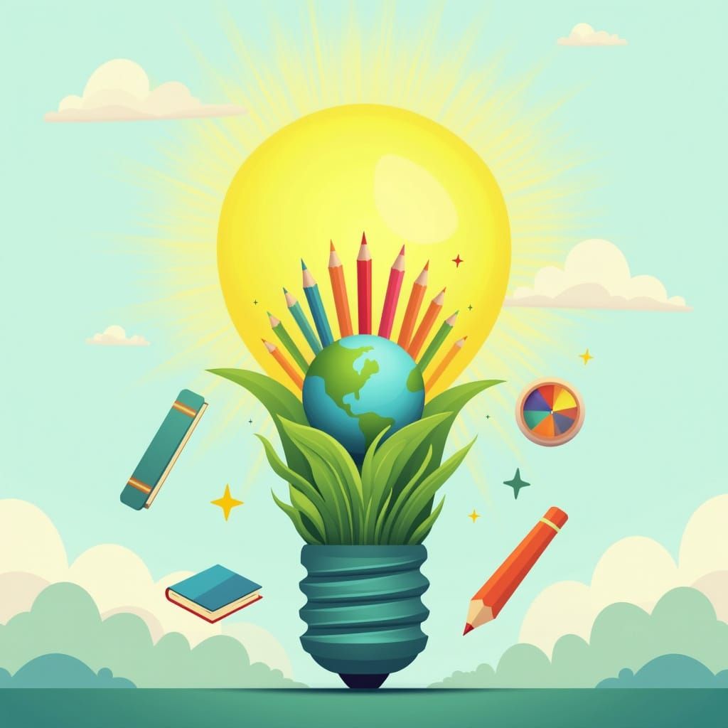 This image shows a stylized, glowing light bulb made from lush green leaves and colorful pencils, with a small earth globe inside surrounded by art tools, set against a soft gradient sky blue to yellow background.