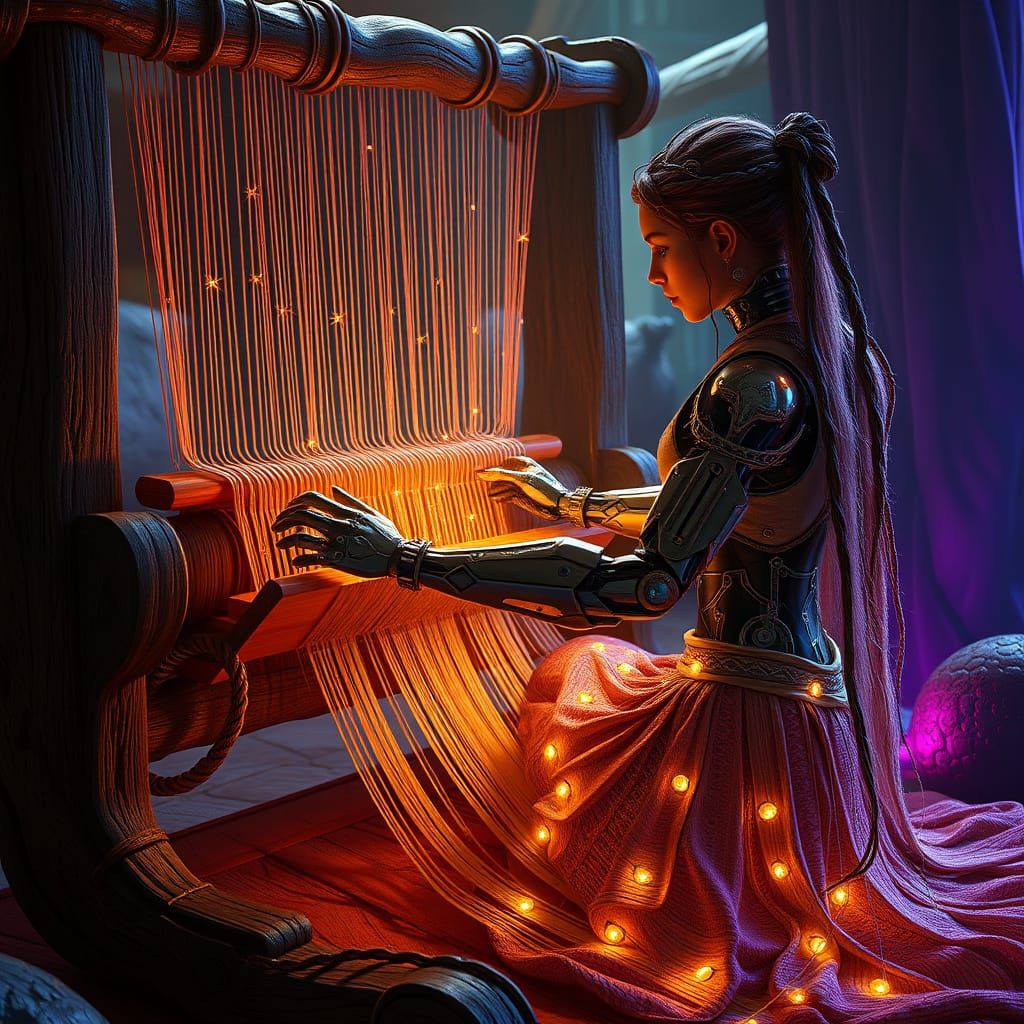 A sci-fi storyteller with mechanical limbs weaves glowing historical threads into tapestries on a large ancient wood and crystal loom. Warm, cinematic lighting sets an epic atmosphere.