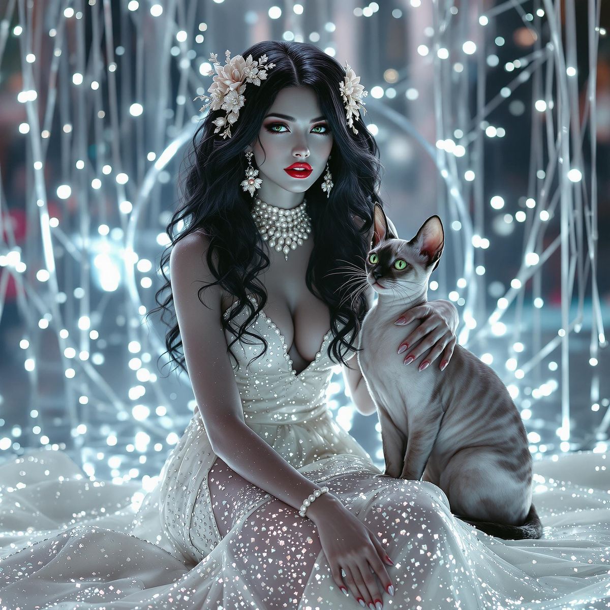 A striking picture of a young woman with gray skin and her cat, set within a light art performance. The artwork features airbrushing and rhinestone details, creating a futuristic aesthetic.