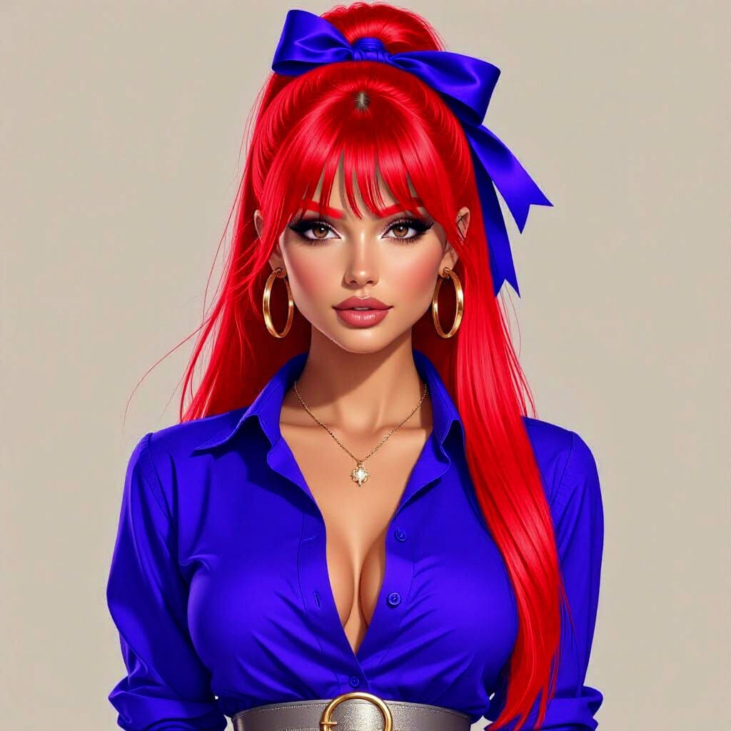 This image shows a tanned Italian-American woman in a high-fashion photograph. She is young and alluring, with long black hair in a ponytail, dramatic makeup, and a violet-red shirt, rendered with a 3D effect.