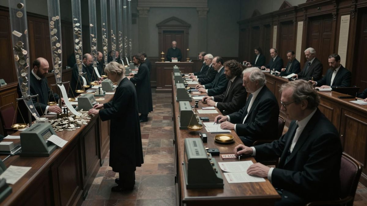 This image depicts a sterile, dystopian concept art scene of a grand hall where absolution is a transaction. Clergy weigh guilt against gold, with currency flowing through tubes under harsh lighting.
