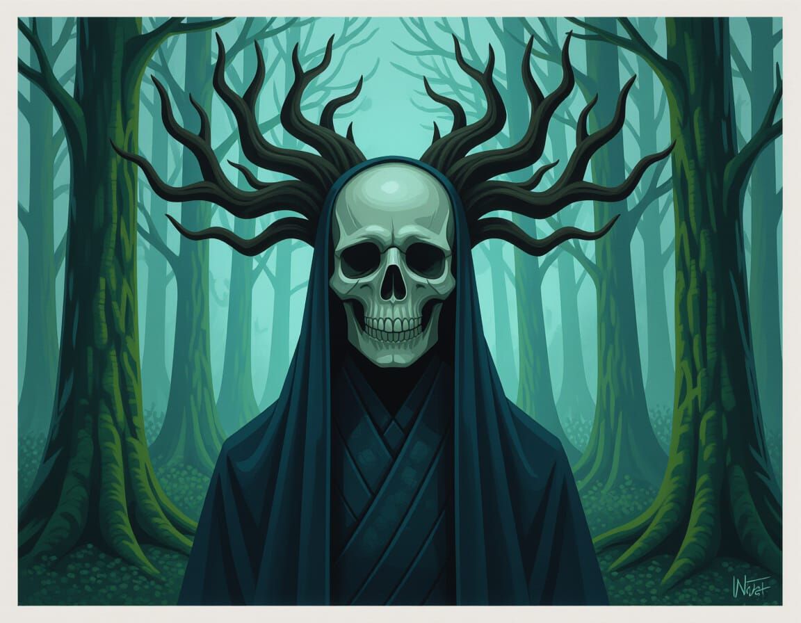 A striking picture of a surreal forest spirit with a skull-like face. The artwork evokes a sense of melancholy and meditation, rendered as digital fantasy illustration.