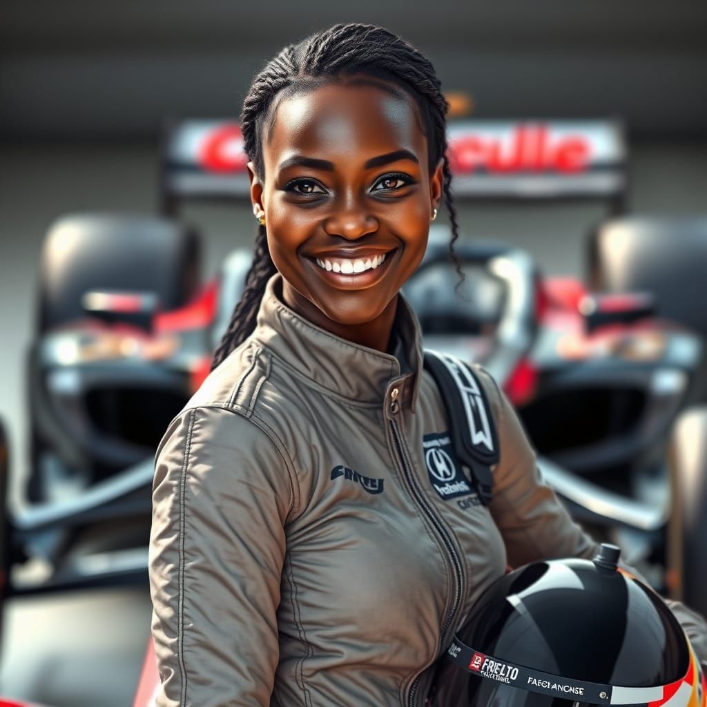 This image features a photorealistic portrait of a confident dark skinned woman in a Formula One racing suit, posing with a helmet and a blurred background of a high-speed car, showcasing lifelike textures and lighting reminiscent of detailed digital art