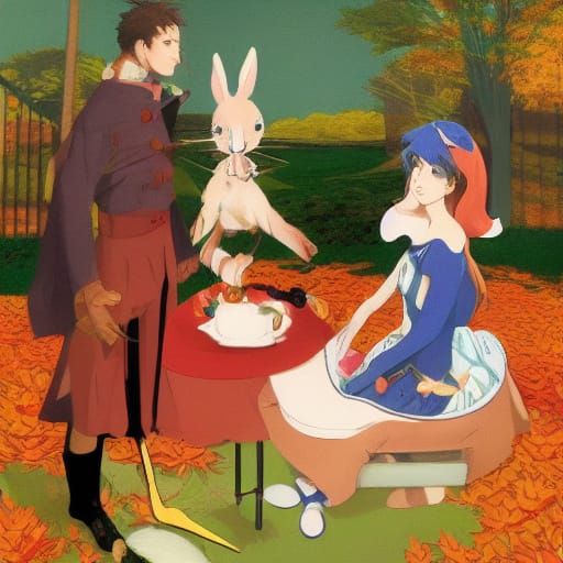 This image shows a whimsical autumn date night scene with a rabbit. The artwork blends pop art elements with a touch of American Gothic style, creating a surreal and colorful composition.