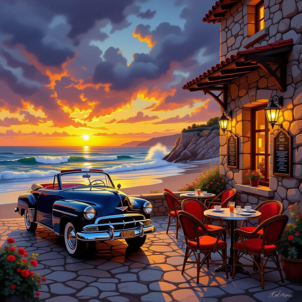 A vivid oil painting of a vintage car outside a cafe near a stormy beach at sunset. The artwork features warm golden hues, detailed stonework, and soft shadows in a realistic style.
