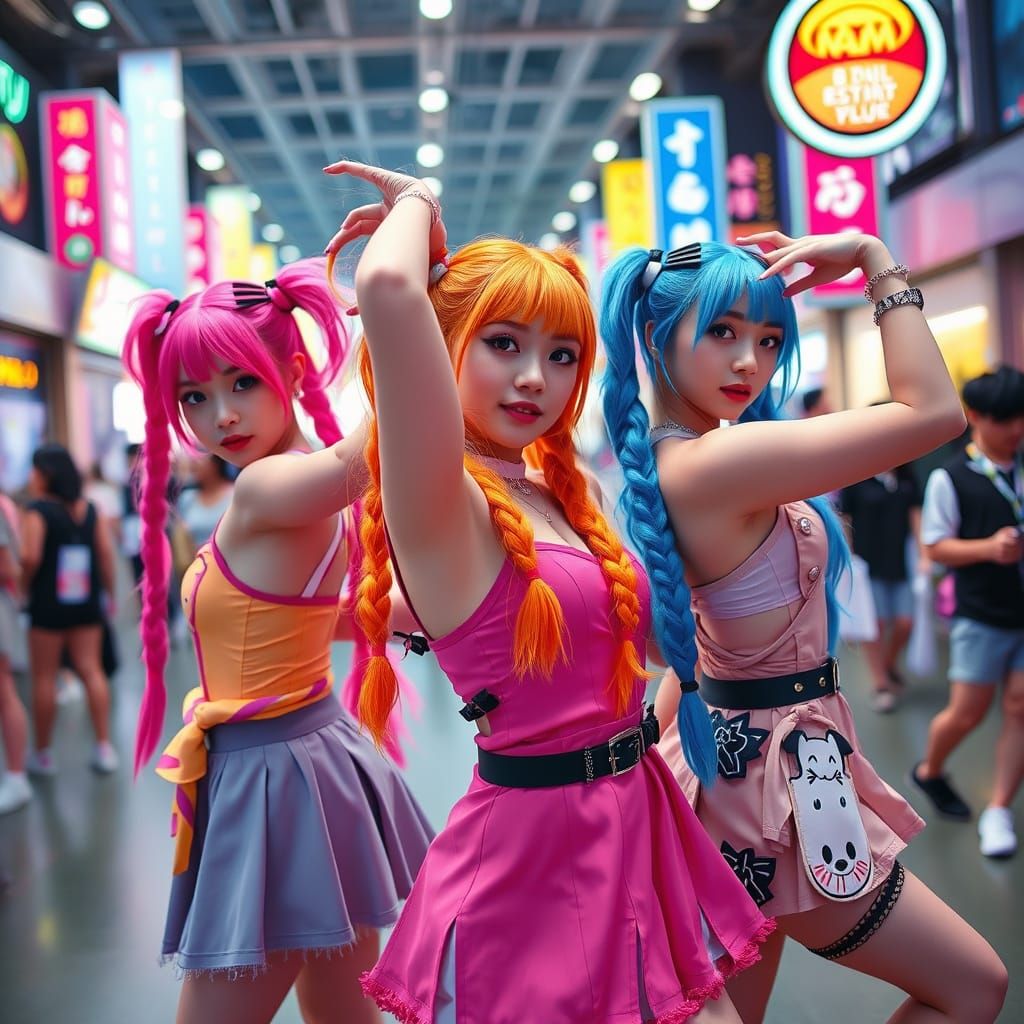 This image depicts girls in dynamic poses, dressed as vibrant K-pop idols with colorful hair, performing against a neon-lit, graphic backdrop. Features graffiti and splash art elements.