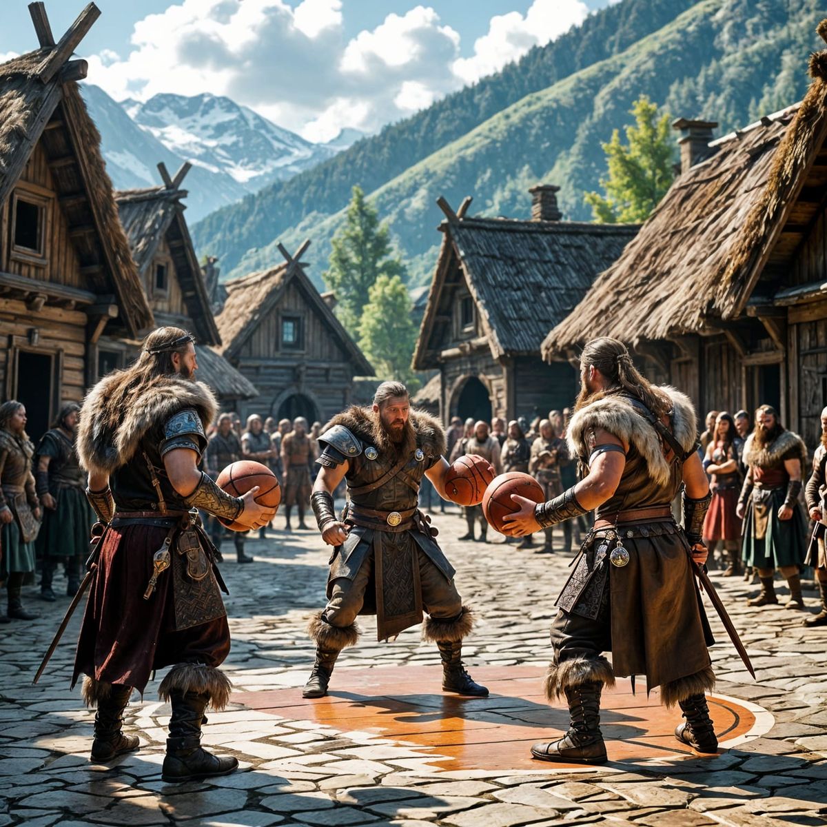 This image shows Viking warriors playing basketball in a scenic medieval town. This cinematic film still features dramatic, atmospheric lighting and meticulous detail, reminiscent of a digital matte painting.