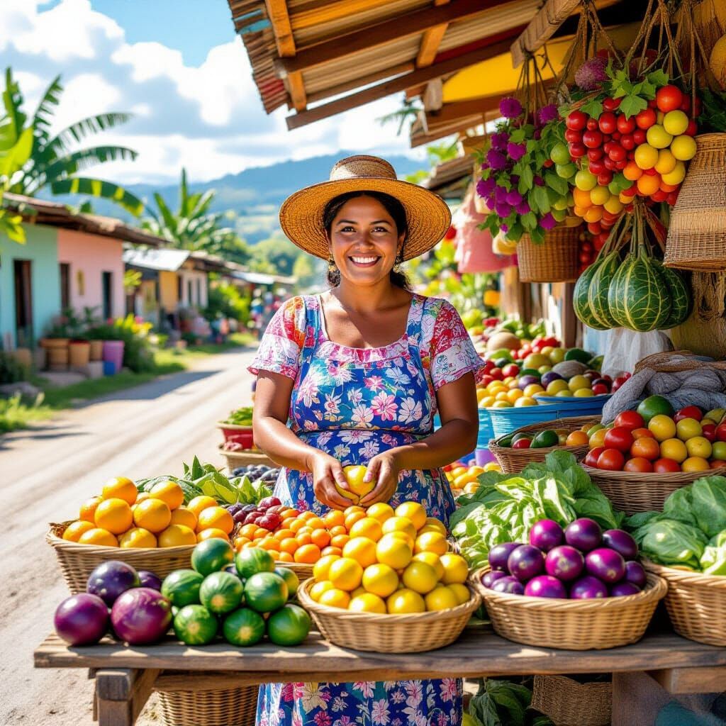 A vibrant scene of a Colombian woman farmer showcasing her harvest at a roadside stall. Her stall overflows with tropical produce and crafts, set against a sunny rural backdrop, all rendered in a rich, textured painterly style.