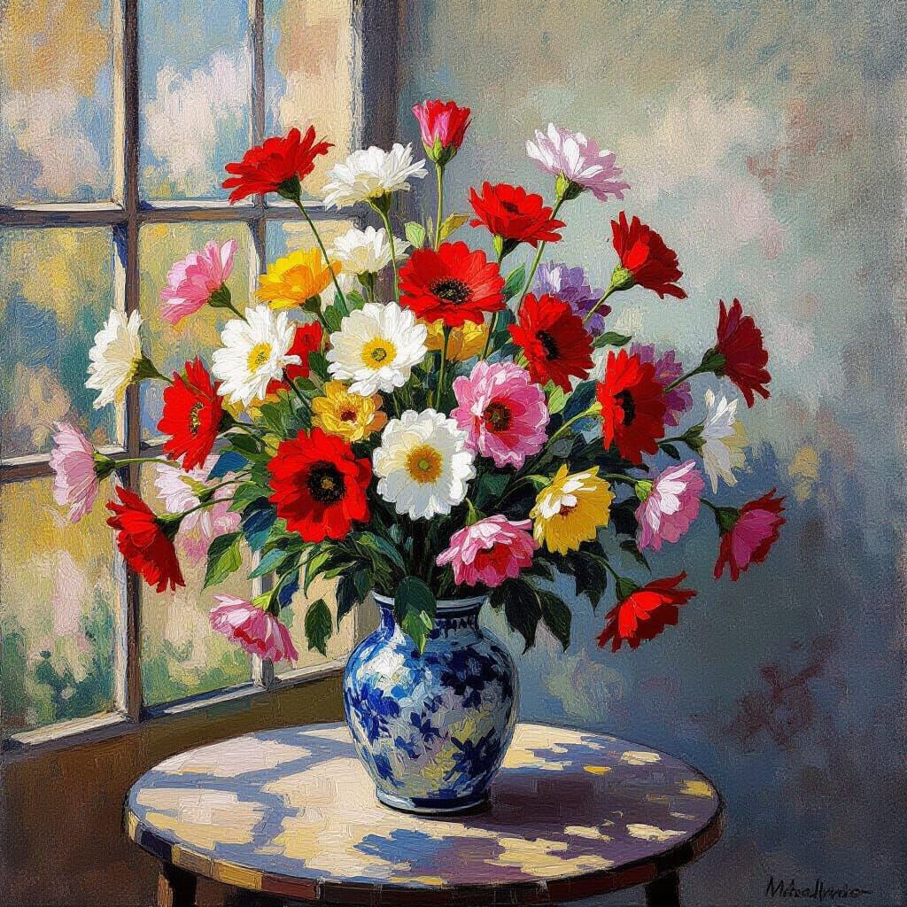 A vibrant display of colorful flowers arranged within a checkered pattern. The image evokes a post-impressionist style, with a light atmosphere and spontaneously applied brushstrokes.