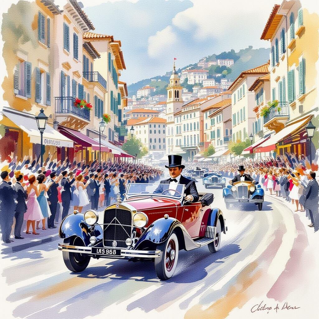 This image shows a vintage Citroen racing through Monaco in the 1880s. The driver is a gentleman in a suit, set against a backdrop of period architecture and celebrating crowds, rendered in soft impressionistic watercolor.