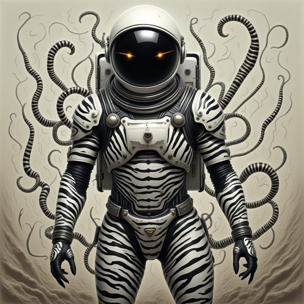 This AI-generated image features an astronaut in a unique Zebrpunk aesthetic, blending futuristic space exploration with bold zebra patterns.